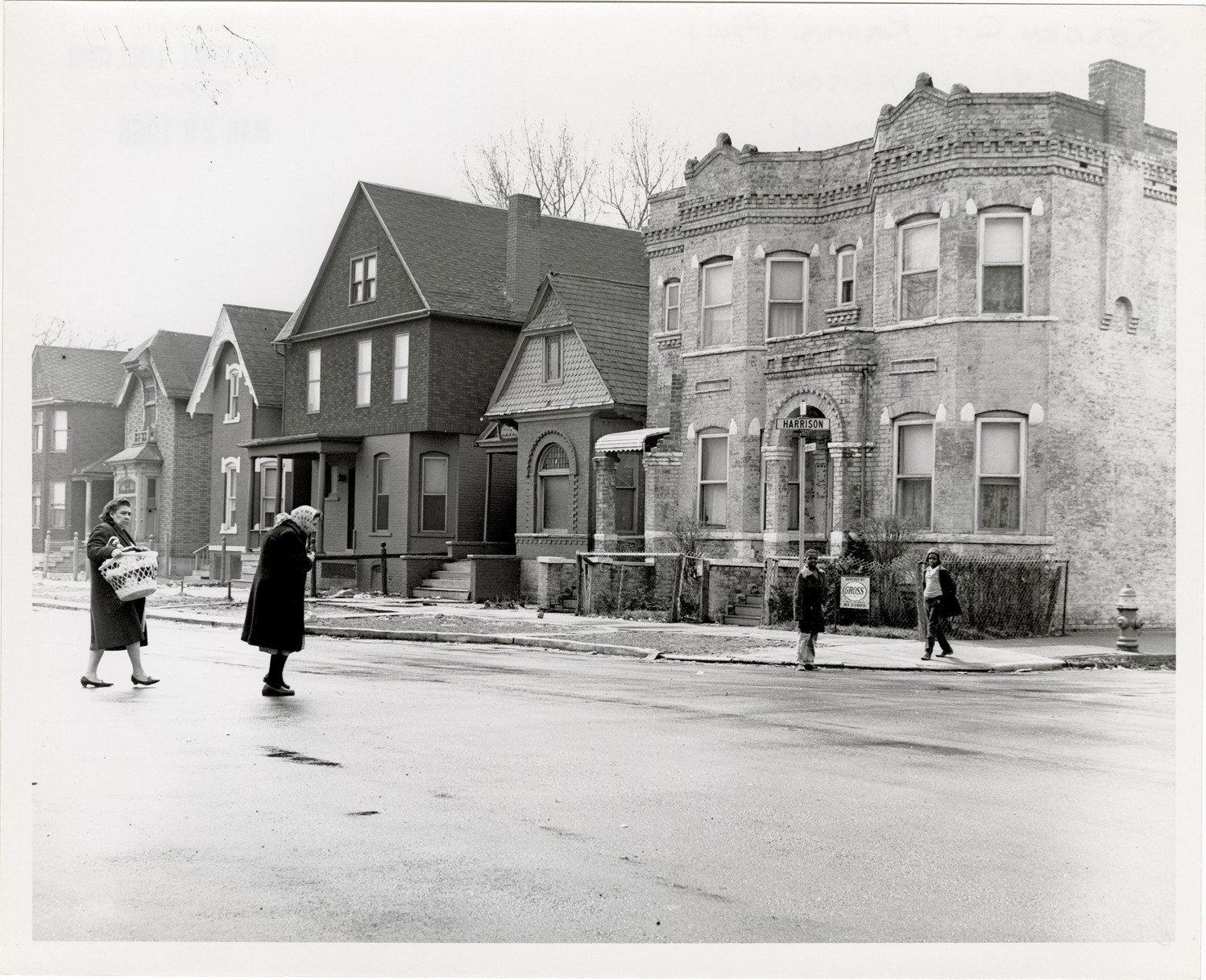 View of brick houses located at 3637-3641 Harrison. Two women with laundry basket cross the street; two boys stand on corner. Stamped on back: "Taken Mar 28, 1966." Handwritten on back: "Selden Ct. Rehab. Proj. 3637-41 Harrison. To be removed."