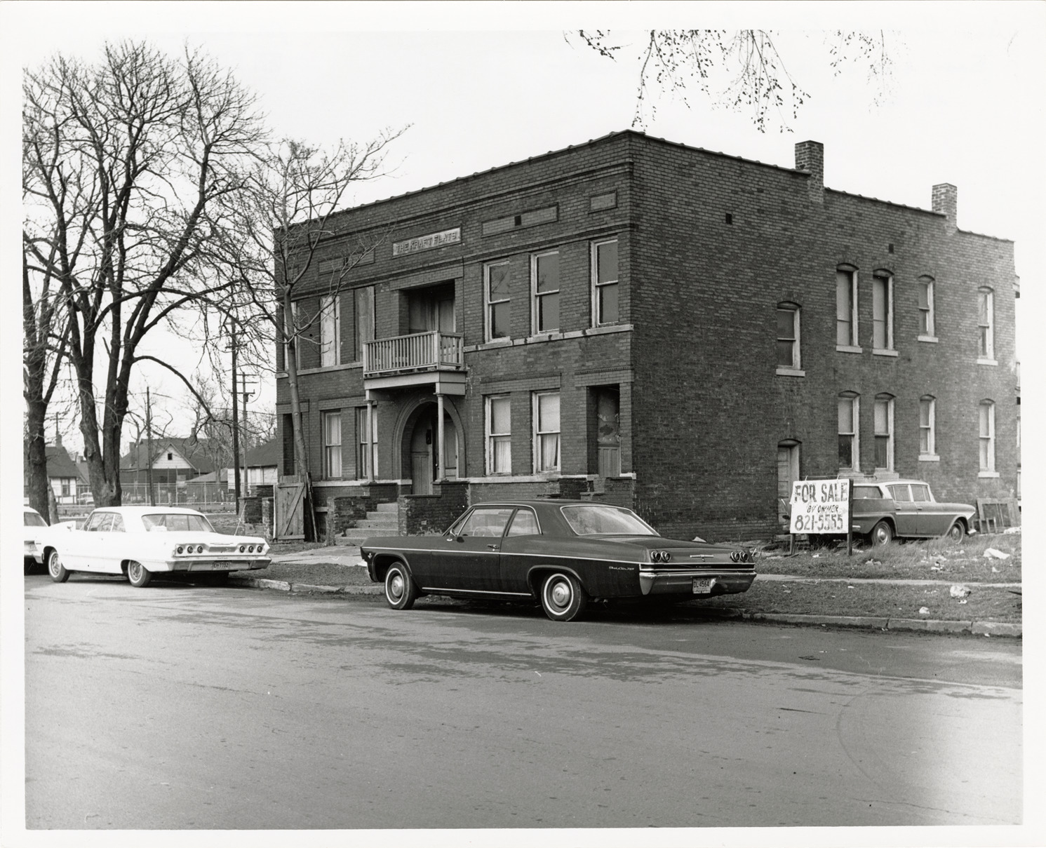 View of a brick apartment building located on 18th St., south of Butternut. "The Kraft Flats" is inscribed over doorway; "For sale by owner" sign adjacent to building. Cars are parked in street. Stamped on back: "Taken Mar 28, 1966." Handwritten on back: "Ash-Humboldt Rehab. Project. East side of 18th, south of Butternut. To be acquired."