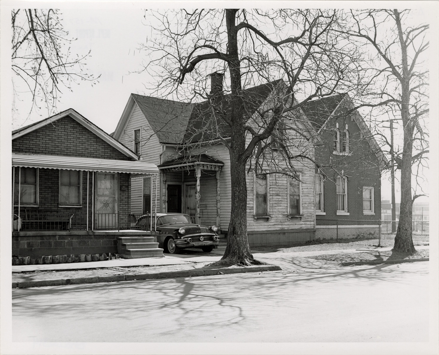 View of three houses located on Humboldt, near Butternut. Car is parked in driveway. Stamped on back: "Taken Mar 28, 1966." Handwritten on back: "Ash-Humboldt Rehab. East side of Humboldt @ Butternut. House on corner not to be acquired. Two adjacent to be acquired."