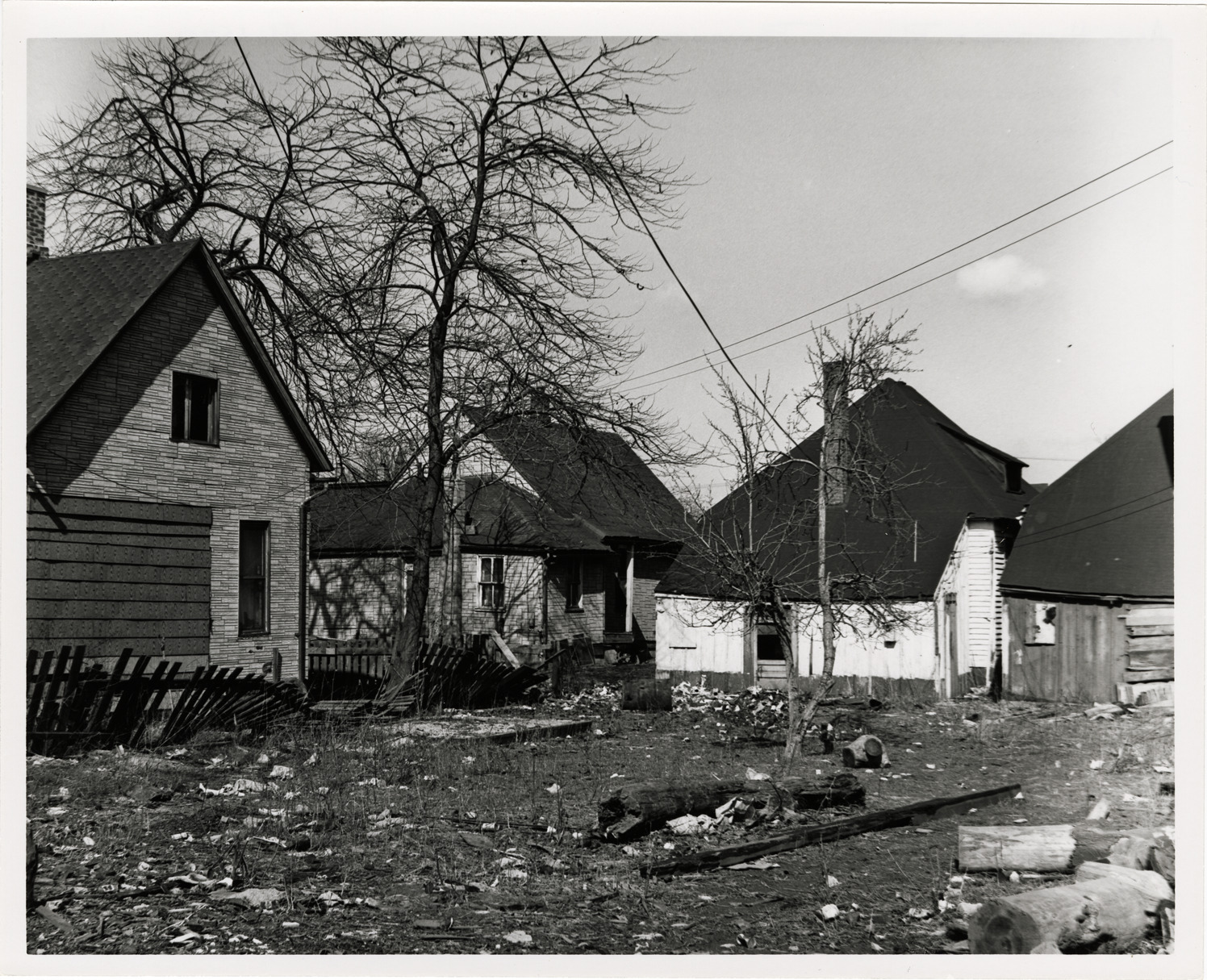Rear view of houses located on 18th St. and Myrtle. Empty lot strewn with debris in foreground. Stamped on back: "Taken Mar 28, 1966." Handwritten on back: "Ash-Humboldt Rehab. Project. 3 structures on west side of 18th. 1 structure on south side of Myrtle. All to be acquired."