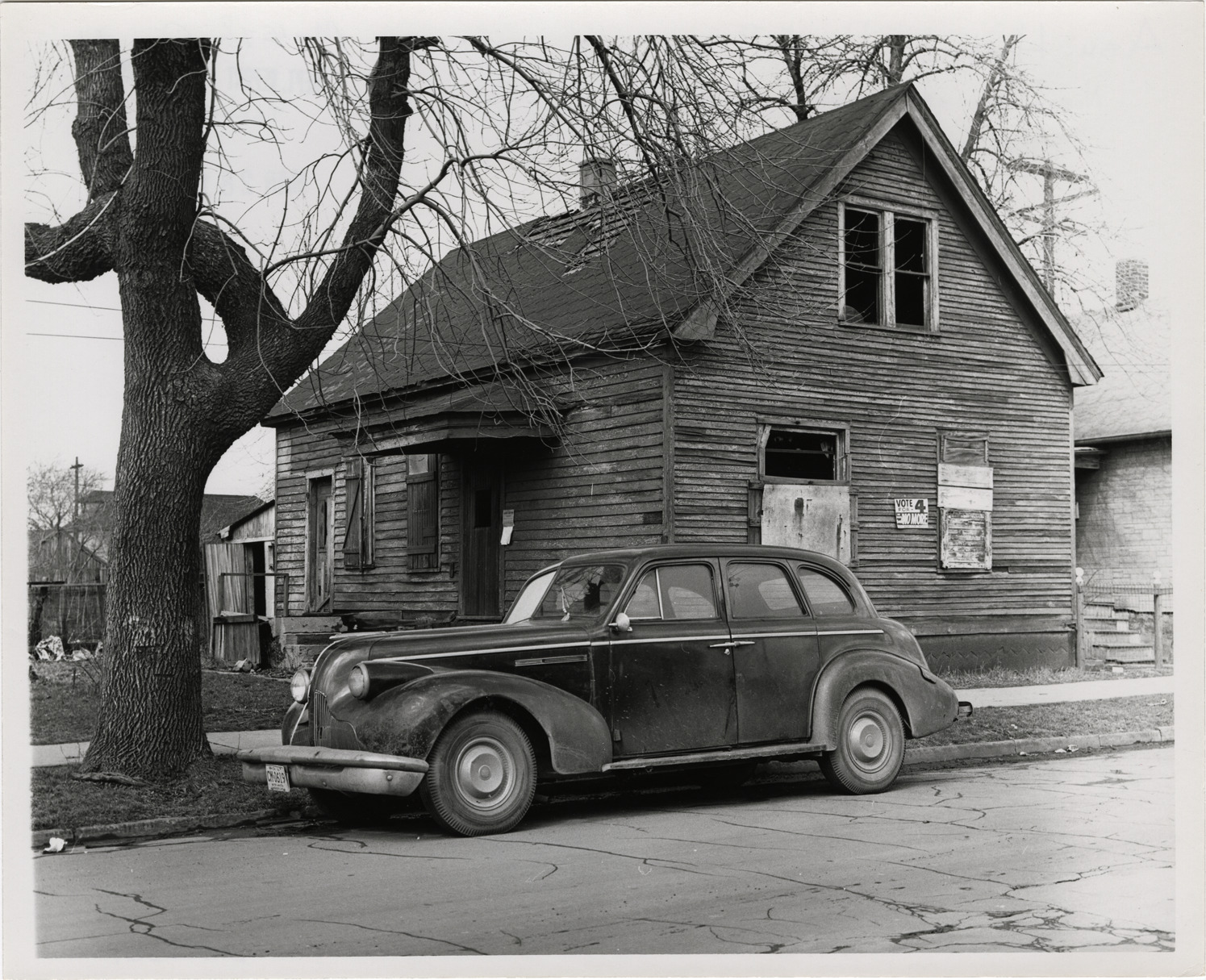 Favorite this☆ Abandoned house on Butternut Description: View of an abandoned wooden-frame house located on Butternut, east of Lawton. Car is parked in street. Stamped on back: "Taken Mar 28, 1966." Handwritten on back: "Ash-Humboldt Rehab. Project. North side of Butternut, E. of Lawton. To be acquired." Details Resource ID: bh020337 Subject: Wooden-frame houses--Michigan--Detroit Abandoned houses--Michigan--Detroit Automobiles--Michigan--Detroit Detroit Housing Commission--Archives Photographic prints Date Issued: 1966-03-28 Format: 1 photographic print ; 8 x 10 in. Member of: Burton Historical Collection Filing Location: MS/Detroit Archives. Housing Commission. Ash-Humboldt Rehabilitation Project. 62:32 Rights: Physical rights are retained by DPL. Copyright is retained in accordance with U.S. copyright laws.