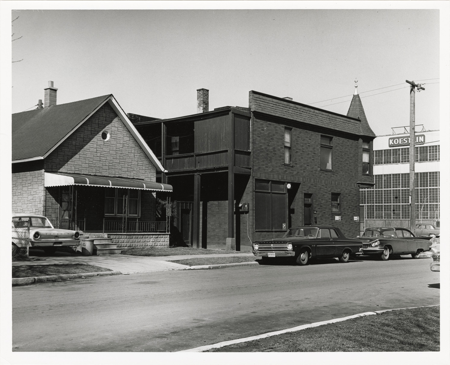 View of a house with simulated stone siding located at 3393 Humboldt and a commercial building located at 3401 Humboldt. Cars are parked in street. Stamped on back: "Taken Mar 28, 1966." Handwritten on back: "Ash-Humboldt Rehab. Project. Looking NW on Humboldt at Myrtle. Humboldt: 3393, house, not to be acquired. 3401, building, to be acquired."