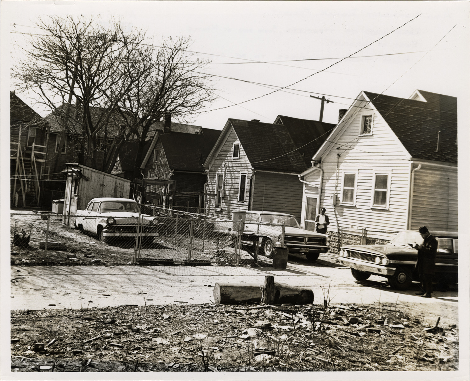 Rear view of wooden-frame houses located on Myrtle, east of Humboldt. Car is parked behind house; another car is parked in a yard, surrounded by chain link fence. Man stands next to house; man with clipboard stands next to car. Alley in foreground. Stamped on back: "Taken Mar 28, 1966." Handwritten on back: "Ash-Humboldt Rehab. Project. Rear view of structures, south side of Myrtle, east Humboldt. Middle three structures to be acquired."
