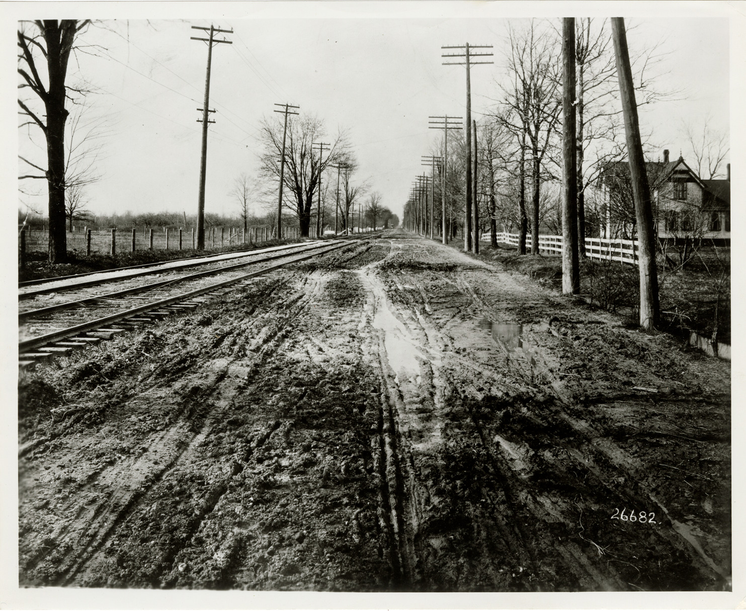 View of Woodward Ave. between 6 Mile Rd. and 7 Mile Rd., as a muddy dirt road. Railroad tracks are visible on left; wooden-frame house on right. Label on back: "Board of Wayne County Road Commissioners. Woodward Avenue. No. 34. Date: 1908." Handwritten on back: "Woodward (bet. 6 & 7 Mile)."
