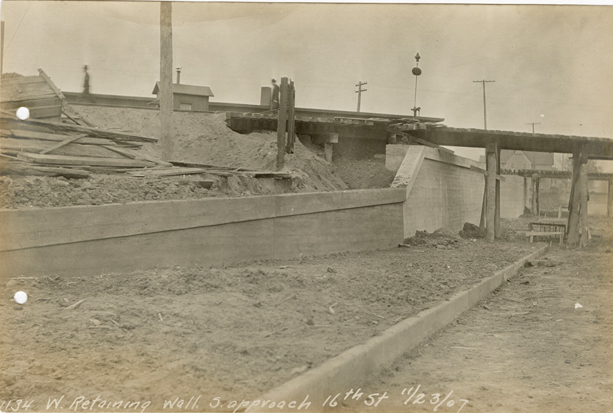 View of the west retaining wall, south approach at 16th St., during construction of the Michigan Central Railroad. Railroad bridge in background. Printed on front: "W. retaining wall, S. approach, 16th St., 11/23/07."
