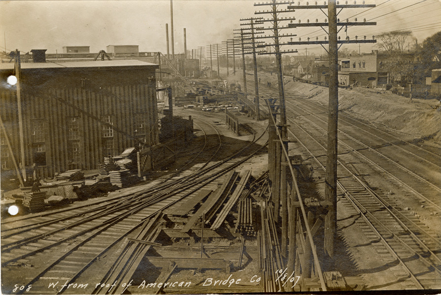 View of railroad tracks looking west from the roof of the American Bridge Company during construction of the Michigan Central Railroad. Building on left. Printed on front: "W. from roof of American Bridge Co., 10/8/07."