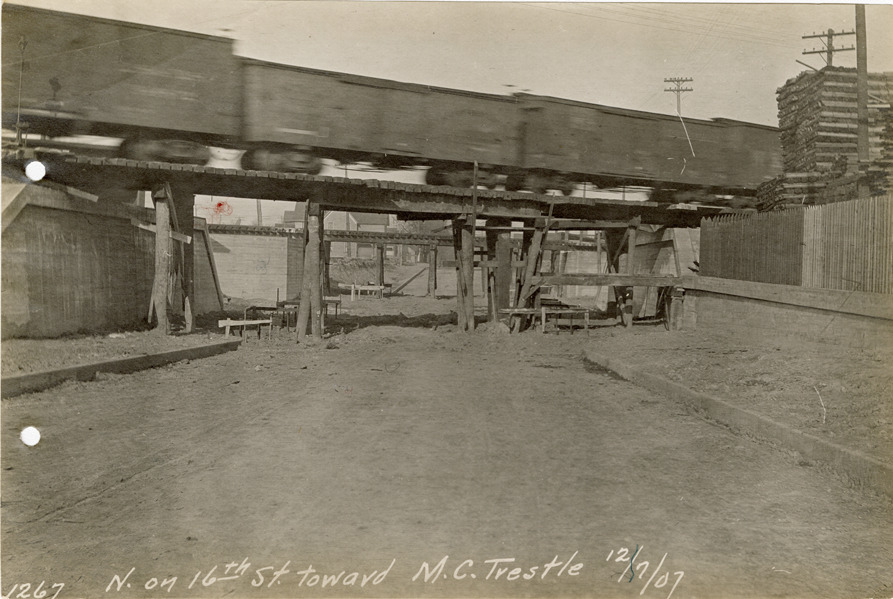 View of freight cars on a railroad bridge over 16th St., during construction of the Michigan Central Railroad. Printed on front: "N. on 16th St. toward M.C. trestle, 12/7/07."