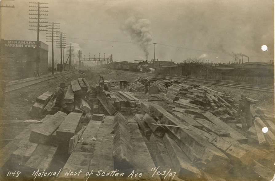 View of workers moving railroad ties and lumber west of Scotten Ave. during construction of the Michigan Central Railroad. Printed on front: "Material west of Scotten Ave., 11/23/07." Original image is reversed.