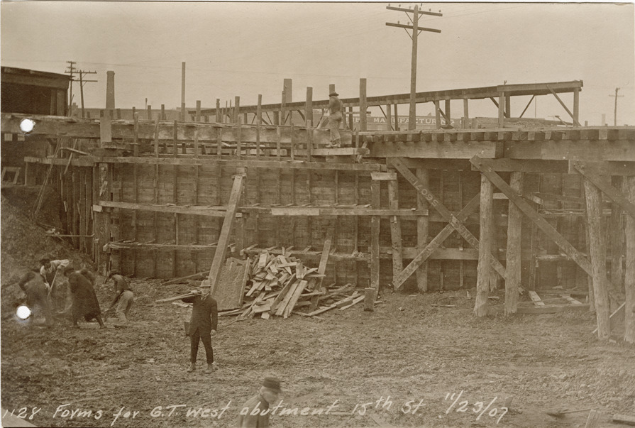 View of workers assembling forms for Grand Trunk west abutment on 15th St. during construction of the Michigan Central Railroad. Printed on front: "Forms for G.T. west abutment, 15th St., 11/23/07."