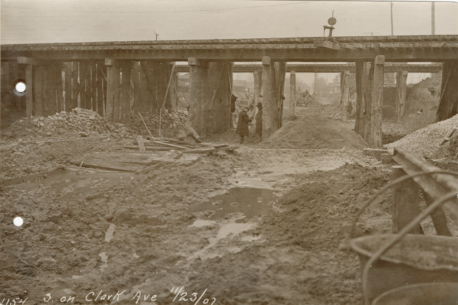 Favorite this☆ Railroad bridges on Clark Avenue, Michigan Central Railroad construction Description: View of railroad bridges on Clark Ave. during construction of the Michigan Central Railroad. Printed on front: "S. on Clark Ave., 11/23/07." Details Resource ID: bh020396 Subject: Railroad bridges--Michigan--Detroit Streets--Michigan--Detroit Michigan Central Railroad Company Railroads--Michigan--Detroit--Design and construction Photographic prints Date Issued: 1907-11-23 Format: 1 photographic print ; 4 x 6 in. Member of: Burton Historical Collection Filing Location: D/Railroads-Michigan Central-Construction, 1907 Rights: Physical rights are retained by DPL. Copyright is retained in accordance with U.S. copyright laws.
