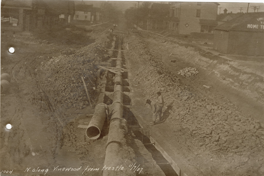 View of excavation of pipe on Vinewood St., during construction of the Michigan Central Railroad. Two workers stand in foreground. Printed on front: "N. along Vinewood from trestle, 11/7/07."