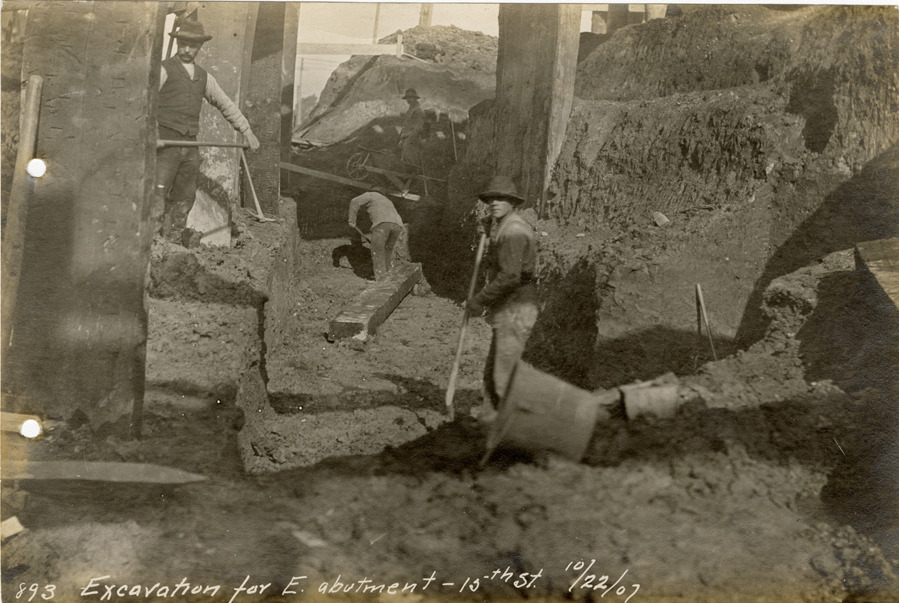 Workers excavating east abutment on 15th Street, Michigan Central Railroad construction