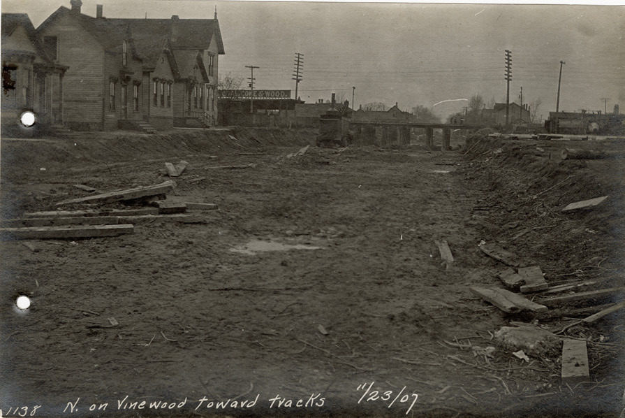 View of Vinewood St. during construction of the Michigan Central Railroad. Railroad bridge and wooden-frame houses in background. Printed on front: "N. on Vinewood toward tracks, 11/23/07."