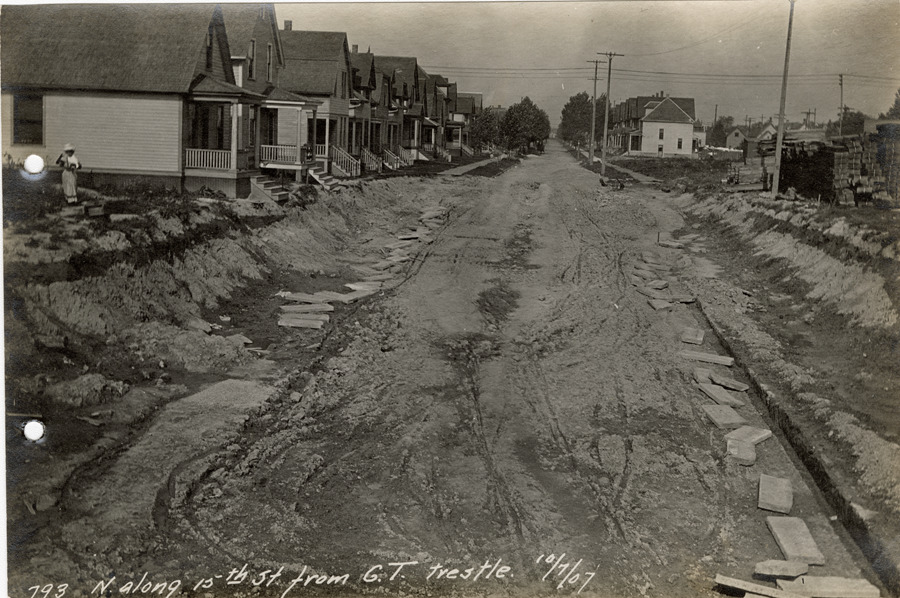 View of 15th St. from Grand Trunk railroad bridge during construction of the Michigan Central Railroad. Wooden-frame houses in background. Printed on front: "N. along 15th St. from G.T. trestle, 10/7/07."
