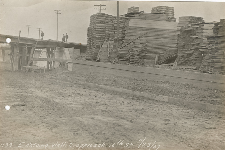 View of east retaining wall on 16th St. during construction of the Michigan Central Railroad. Stacks of lumber on right. Printed on front: "E. retaining wall, S. approach 16th St., 11/23/07."