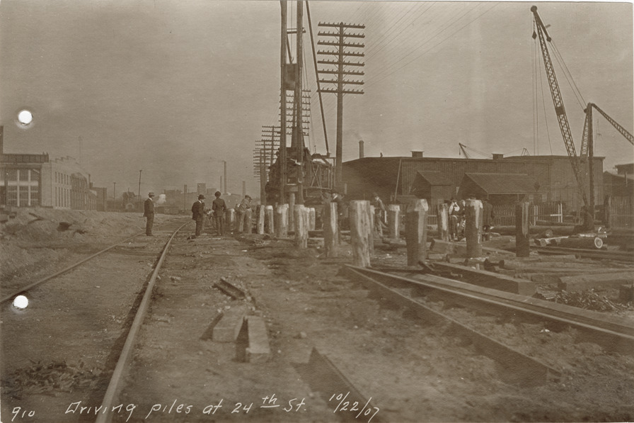 Favorite this☆ Pile driver on 24th Street, Michigan Central Railroad construction Description: View of pile driver on 24th St. during construction of the Michigan Central Railroad. Printed on front: "Driving piles at 24th St., 10/22/07." Details Resource ID: bh020439 Subject: Pile drivers Piling (Civil engineering) Michigan Central Railroad Company Railroads--Michigan--Detroit--Design and construction Photographic prints Date Issued: 1907-10-22 Format: 1 photographic print ; 4 x 6 in. Member of: Burton Historical Collection Filing Location: D/Railroads-Michigan Central-Construction, 1907 Rights: Physical rights are retained by DPL. Copyright is retained in accordance with U.S. copyright laws.
