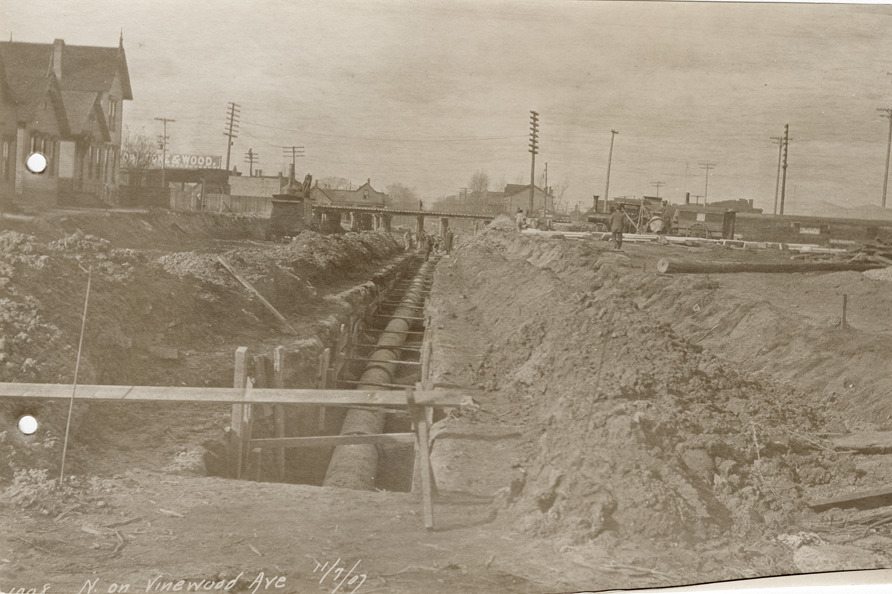 Favorite this☆ Excavation of pipe on Vinewood Street, Michigan Central Railroad construction Description: View of excavation of pipe on Vinewood St., during construction of the Michigan Central Railroad. Printed on front: "N. on Vinewood Ave. [sic], 11/7/07." Details Resource ID: bh020446 Subject: Excavation--Michigan--Detroit Pipe Michigan Central Railroad Company Railroads--Michigan--Detroit--Design and construction Photographic prints Date Issued: 1907-11-07 Format: 1 photographic print ; 4 x 6 in. Member of: Burton Historical Collection Filing Location: D/Railroads-Michigan Central-Construction, 1907 Rights: Physical rights are retained by DPL. Copyright is retained in accordance with U.S. copyright laws.