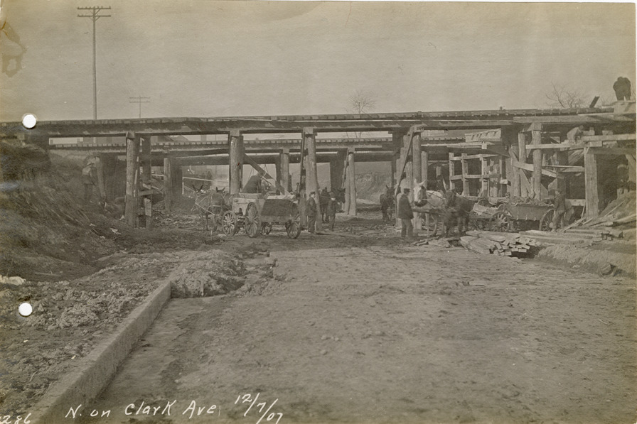View of workers with horse-drawn wagons under railroad bridges on Clark Ave. during construction of the Michigan Central Railroad. Printed on front: "N. on Clark Ave., 12/7/07."