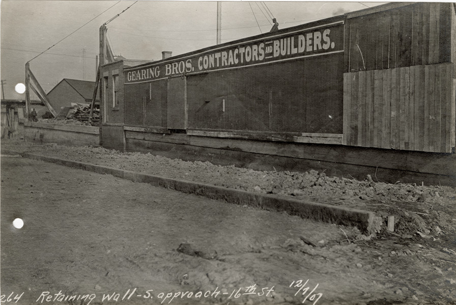 View of a retaining wall in front of Gearing Bros. building on 16th St. during construction of the Michigan Central Railroad. Sign on building reads: "Gearing Bros., contractors and builders." Printed on front: "Retaining wall, S. approach, 16th St., 12/7/07."