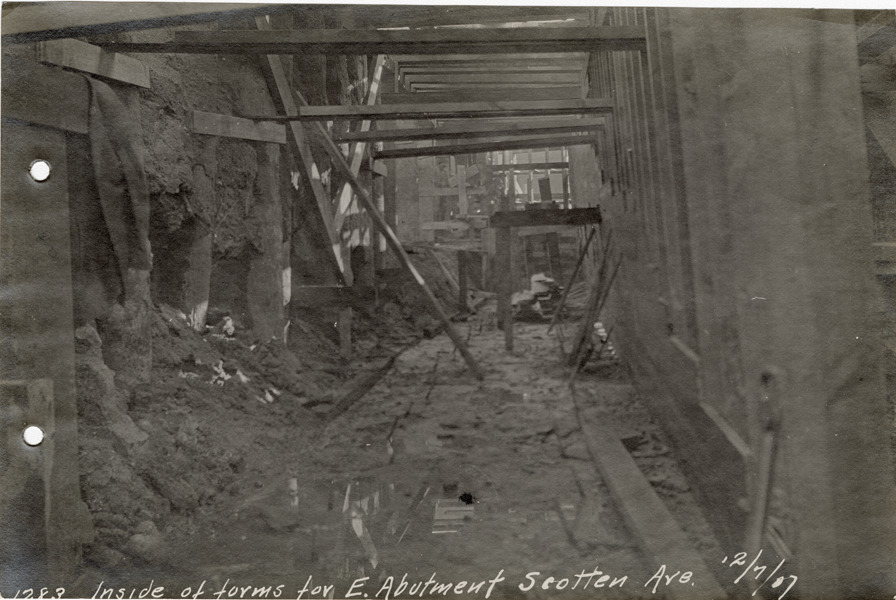 View of forms for abutment on Scotten Ave. during construction of the Michigan Central Railroad. Printed on front: "Inside of forms for E. abutment, Scotten Ave., 12/7/07."