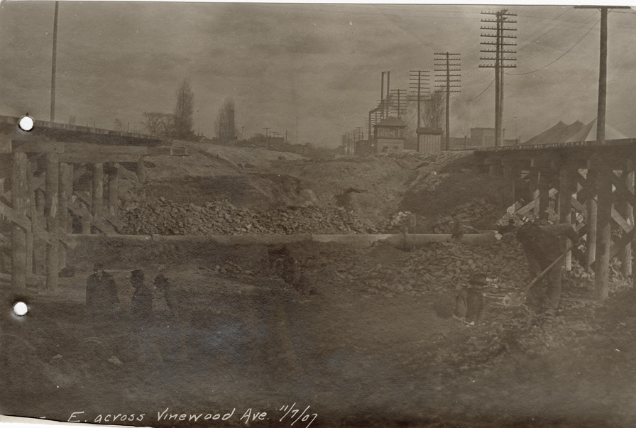 View of workers excavating for pipe on Vinewood St. between two railroad bridges, during construction of the Michigan Central Railroad. Printed on front: "E. across Vinewood Ave. [sic], 11/7/07."