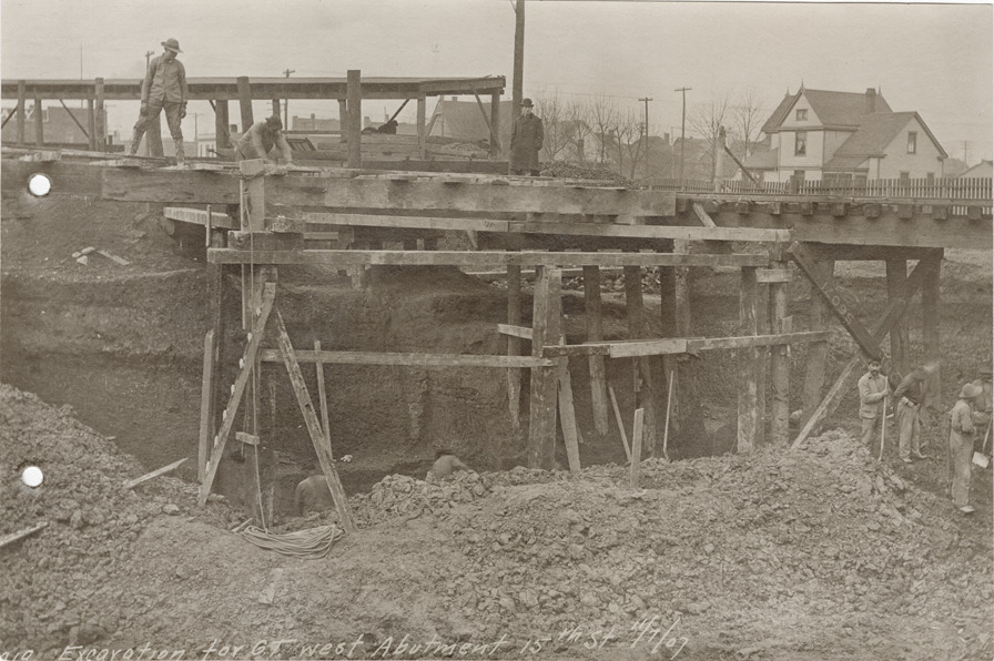 Excavation for Grand Trunk abutment on 15th St., Michigan Central Railroad construction