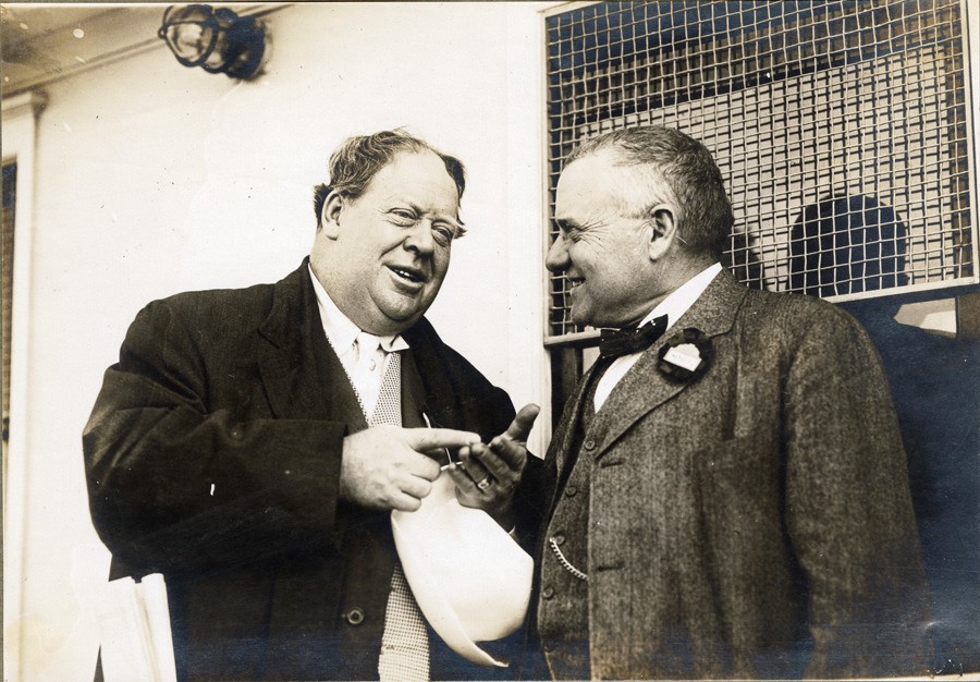 Close-up view of two men conversing on the deck of the ferry "City of Detroit III" during the Detroit Board of Commerce Eleventh Annual Cruise to Duluth, Minnesota. Embossed on scrapbook cover: "Detroit Board of Commerce. Eleventh Anniversary Cruise. Charles B. Warren."