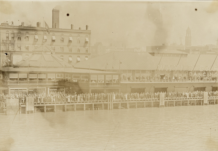 Crowd on dock in front of Wayne Hotel, Gardens and dance pavilion, Detroit Board of Commerce, Eleventh Annual Cruise