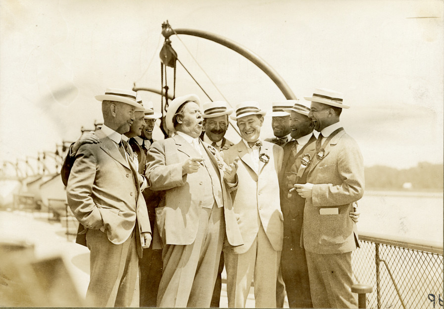 Men laughing on ferry, Detroit Board of Commerce, Eleventh Annual Cruise