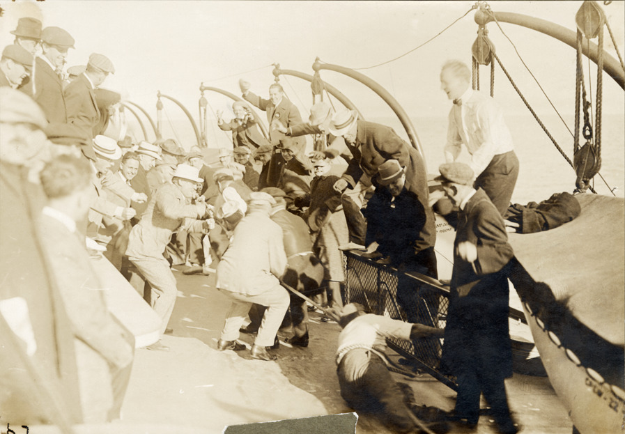 Men playing tug of war on ferry, Detroit Board of Commerce, Eleventh Annual Cruise