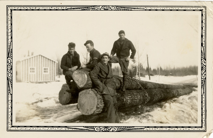 View of four men posing on cut logs at Camp Escanaba, Civilian Conservation Corps, Company 1620 in Escanaba, Michigan. Barracks in background. Stamped on back: "Arrow Photo Service, Box 1586, Minneapolis, Minn."