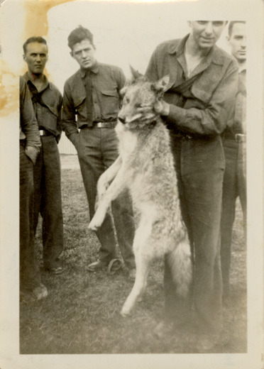 View of several men, in uniform, posing with coyote at Camp Escanaba, Civilian Conservation Corps, Company 1620 in Escanaba, Michigan. Stamped on back: "Ace Photo Service. Sparkling snapshots. Minneapolis, Minnesota." Handwritten on back: "The coyote they caught around camp."