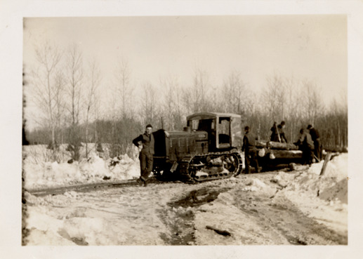 View of men hauling logs with a crawler tractor near Camp Escanaba, Civilian Conservation Corps, Company 1620 in Escanaba, Michigan. Stamped on back: "Rays. Nationally known guaranteed prints, LaCrosse, Wis."