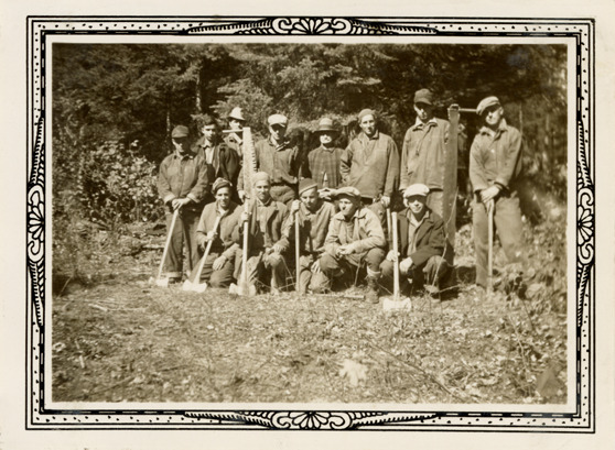 Men posing with axes and saws, Company 1620, Civilian Conservation Corps, Camp Escanaba