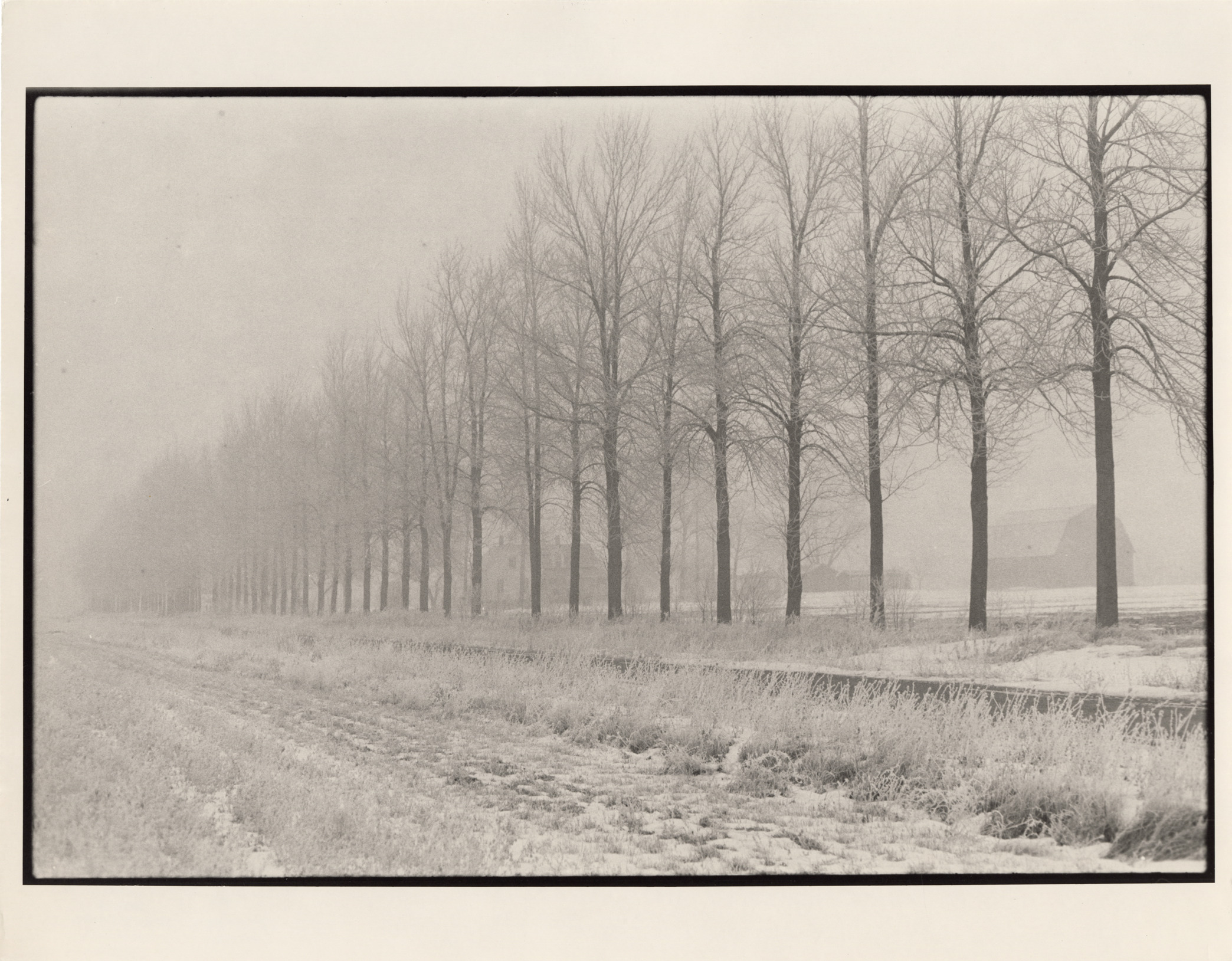 View of row of bare trees on Stafford Rd. in Port Hope, Michigan. Label on back: "Michigan Thumb area--Farms--Alee of trees on Stafford Road, Port Hope, MI, 1970s. (Light version)." Handwritten on back: "Port Hope, MI, 1970s."