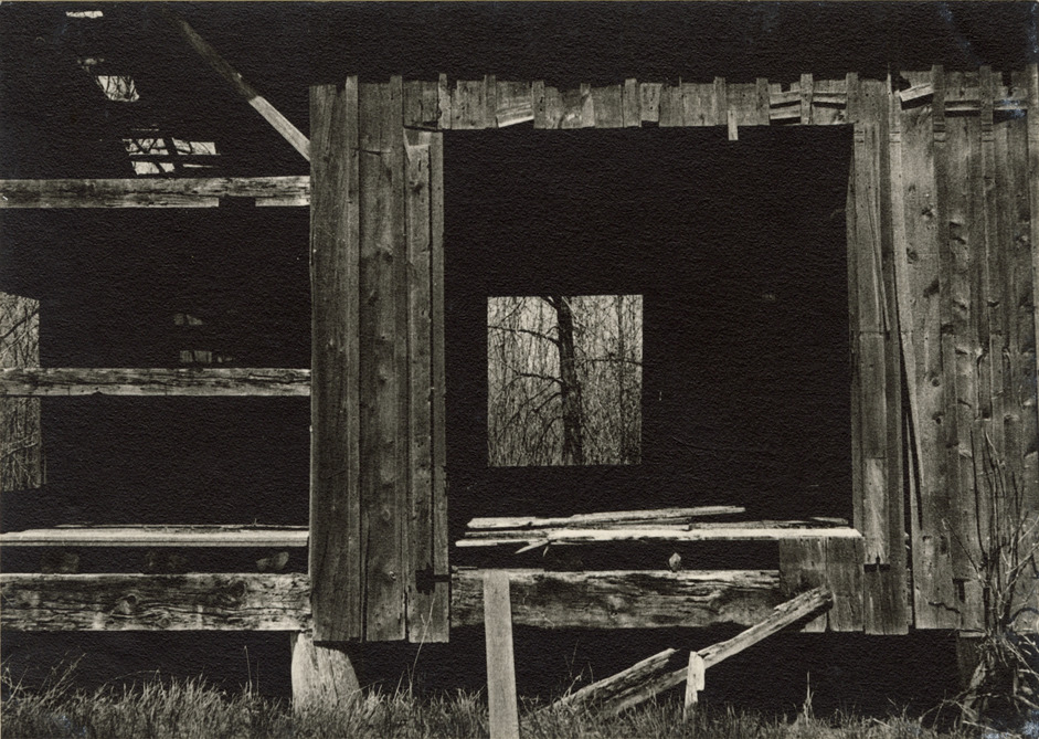 View of an abandoned shed. Handwritten on mat front: "Spr. 71. Steven W. Donahue." Label on back: "Michigan Thumb area--Farms--View to woods through shed windows." Handwritten on back: "Michigan, 1970s."
