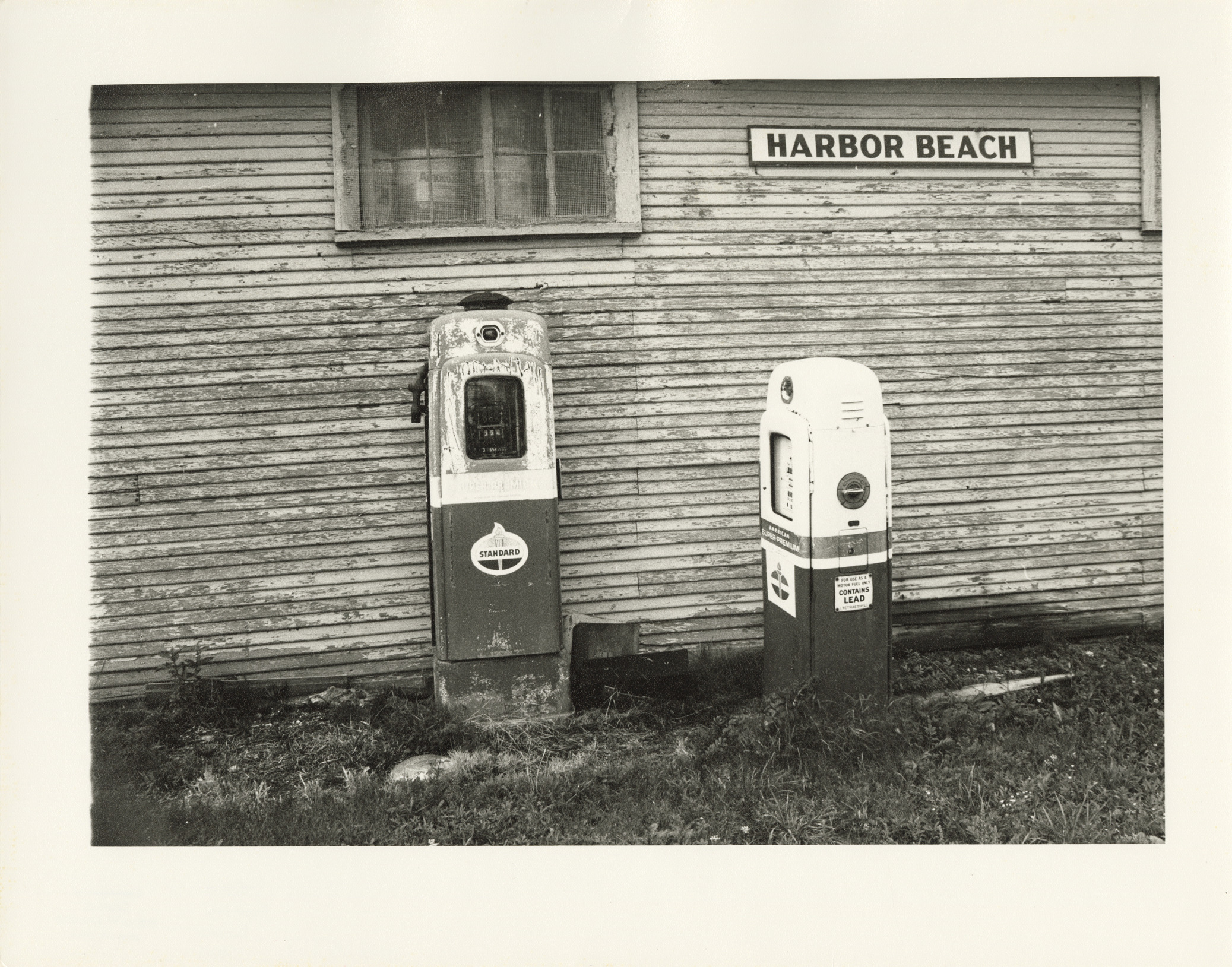 View of two Standard gasoline pumps in front of wooden-frame building. "Harbor Beach" sign is displayed on building. Label on back: "Michigan Thumb area--Past its prime--Gas pumps, Harbor Beach, 1976." Handwritten on back: "From 'Past its prime' show."