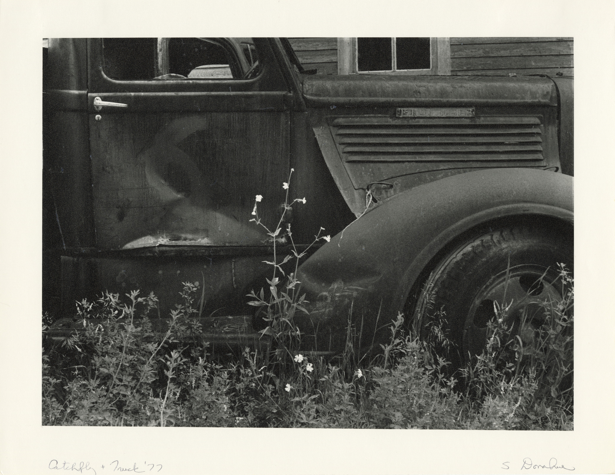 Favorite this☆ Catchfly plant and abandoned Dodge truck Description: Close-up view of a catchfly plant and abandoned Dodge truck. Handwritten on front: "Catchfly & truck, '77. S. Donahue." Label on back: "Michigan Thumb area--Past its prime--Catchfly & truck." Details Resource ID: bh020723 Creator: Donahue, Steven W. Subject: Silene--Michigan--Thumb District Abandonment of automobiles--Michigan--Thumb District Dodge trucks Photographers--Michigan Photographic prints Date Issued: 1977 Format: 1 photographic print ; 11 x 14 in. Member of: Burton Historical Collection Steven W. Donahue Collection Filing Location: MS/Donahue, Steven W., Box 2 Rights: Physical rights are retained by DPL. Copyright is retained in accordance with U.S. copyright laws. Copyright transferred to Detroit Public Library, 2017-09-12.