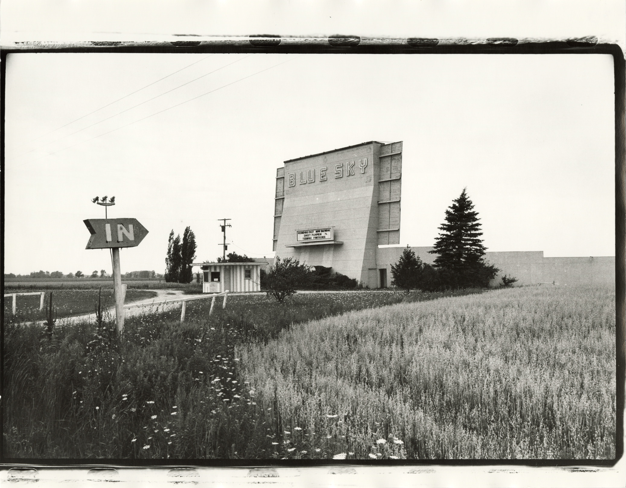 View of the Blue Sky Drive-In theater in Harbor Beach, Michigan. Label on back: "Michigan Thumb area--Small towns--Blue Sky Drive In." Handwritten on back: "Blue Sky Drive In, Harbor Beach, MI, 1970s."