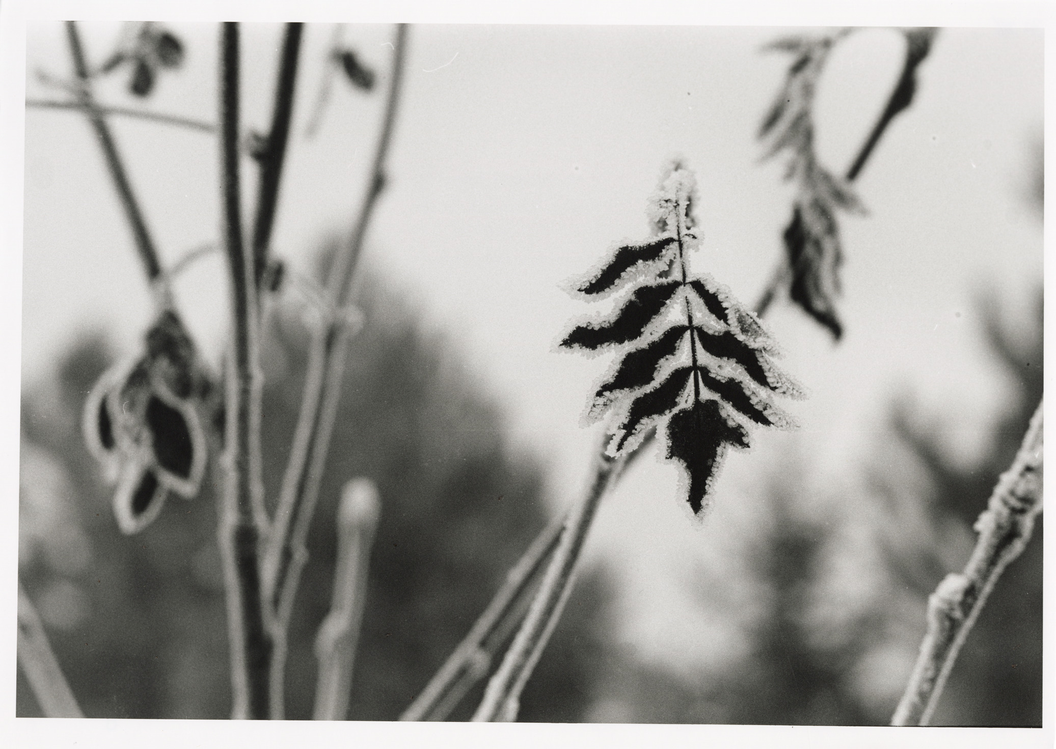 Favorite this☆ Frost on leaves Description: Close-up view of frost on leaves. Label on back: "Michigan Thumb area--Winter--Frosted leaves and branches." Details Resource ID: bh020757 Creator: Donahue, Steven W. Subject: Frost--Michigan--Thumb District Leaves--Michigan--Thumb District Photographers--Michigan Photographic prints Date Issued: Unknown year Format: 1 photographic print ; 10 x 14 in. Member of: Burton Historical Collection Steven W. Donahue Collection Filing Location: MS/Donahue, Steven W., Box 3 Rights: Physical rights are retained by DPL. Copyright is retained in accordance with U.S. copyright laws. Copyright transferred to Detroit Public Library, 2017-09-12.