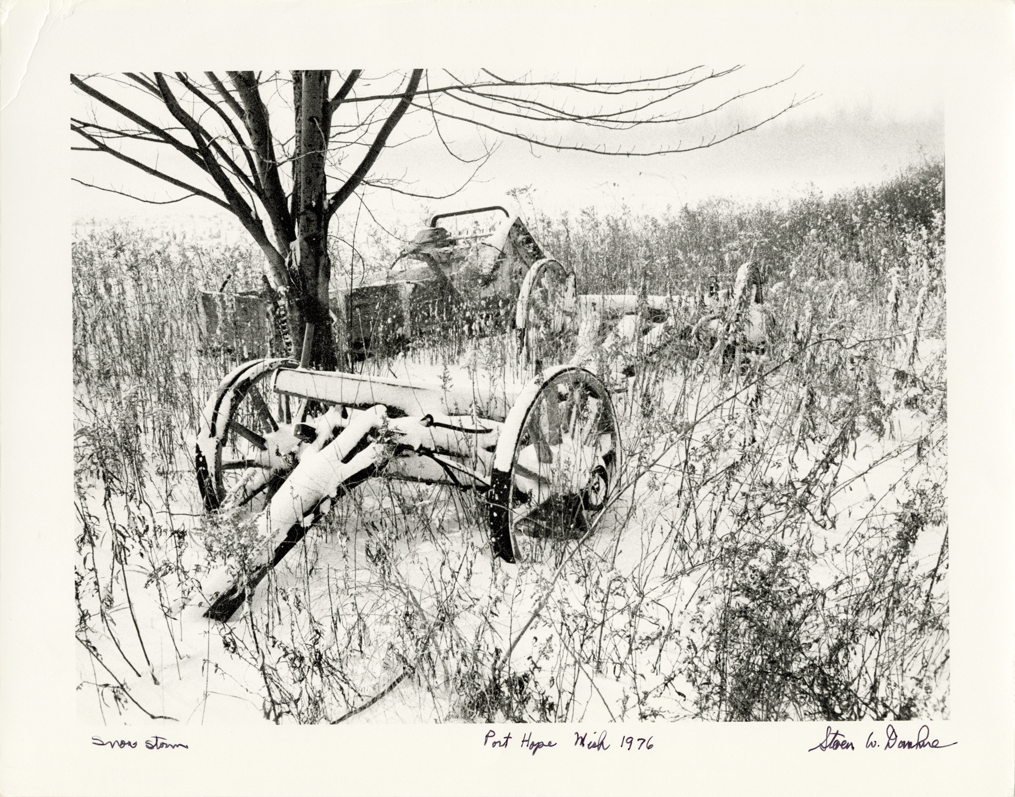 Favorite this☆ Snow-covered hay wagon in field Description: View of snow-covered hay wagon in field during winter. Label on back: "Michigan Thumb area--Winter--Hay wagon in snow, 1976, also called 'Snow storm.'" Details Resource ID: bh020761 Creator: Donahue, Steven W. Subject: Wagons--Michigan--Thumb District Snow--Michigan--Thumb District Photographers--Michigan Photographic prints Date Issued: 1976 Format: 1 photographic print ; 11 x 14 in. Member of: Burton Historical Collection Steven W. Donahue Collection Filing Location: MS/Donahue, Steven W., Box 3 Rights: Physical rights are retained by DPL. Copyright is retained in accordance with U.S. copyright laws. Copyright transferred to Detroit Public Library, 2017-09-12.