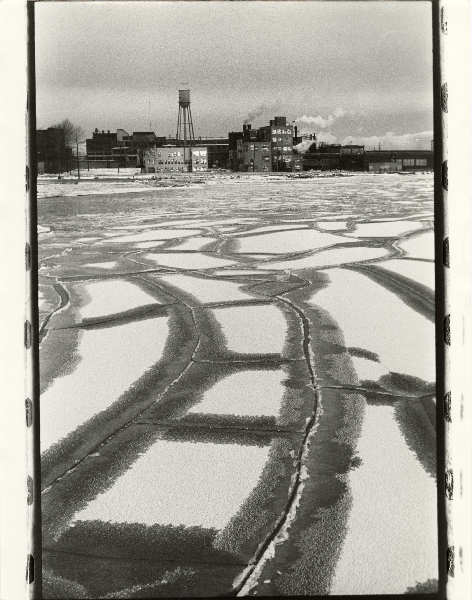 View of ice patterns on Lake Huron at Harbor Beach, Michigan. Factory buildings in background. Label on back: "Michigan Thumb area--Winter--Ice patterns on Lake Huron with factory in background, Harbor Beach, MI, 1970's." Handwritten on back: "Ice in harbor, Harbor Beach, MI, 1970s."