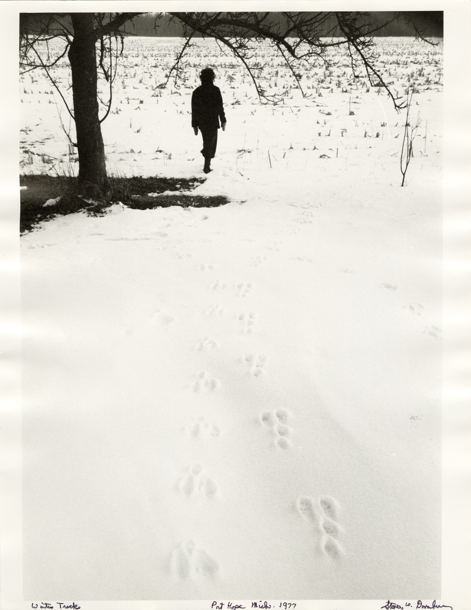 View of Paula Donahue walking through the snow on the Donahue farm, Port Hope, Michigan. Tracks in foreground. Handwritten on front: "Winter tracks, Port Hope, Mich., 1977. Steven W. Donahue." Label on back: "Michigan Thumb area--Winter--Paula walking in the snow at the farm, 1970's."