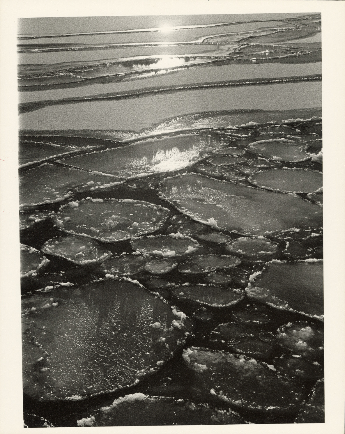 View of ice patterns on Lake Huron at Harbor Beach, Michigan. Handwritten on front: "Ice flow, Harbor Beach, 1977. Steven W. Donahue." Label on back: "Michigan Thumb area--Winter--Round ice patterns." Handwritten on back: "Ice, Lake Huron, 1970's."