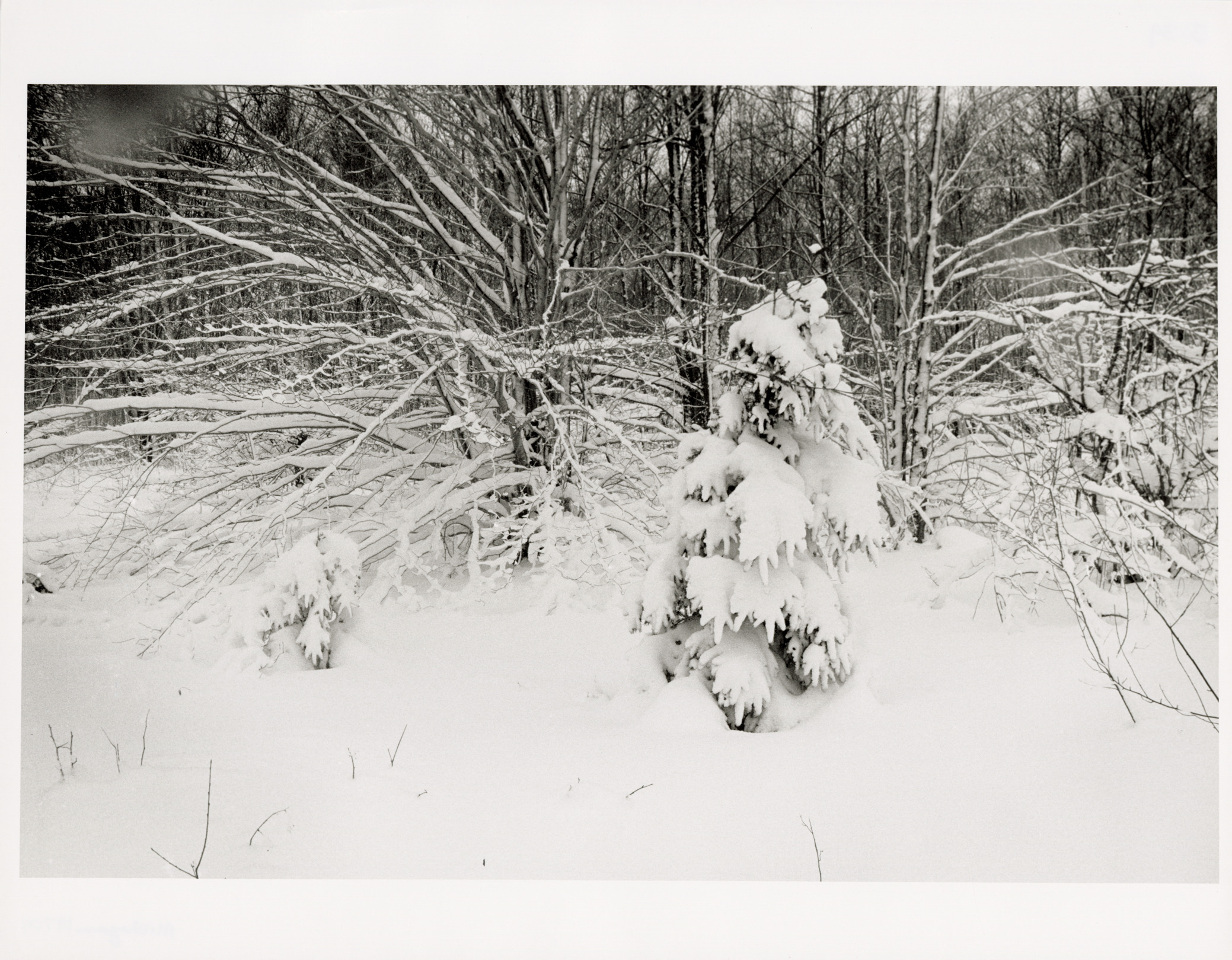 View of snow-covered trees during winter. Label on back: "Michigan Thumb area--Winter--Snow on plants at edge of woods, 1970's." Handwritten on back: "Michigan, 1970's."