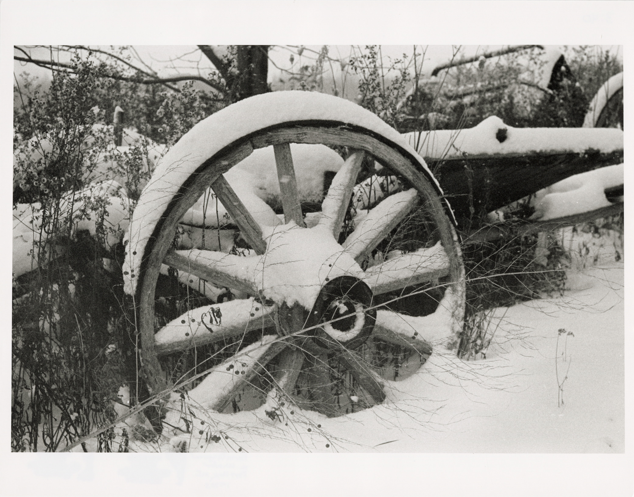 View of a snow-covered wagon wheel in Port Hope, Michigan. Label on back: "Michigan Thumb area--Winter--Snow on wheels, 1970's." Handwritten on back: "Farm equipment in winter, Port Hope, MI, 1970s."