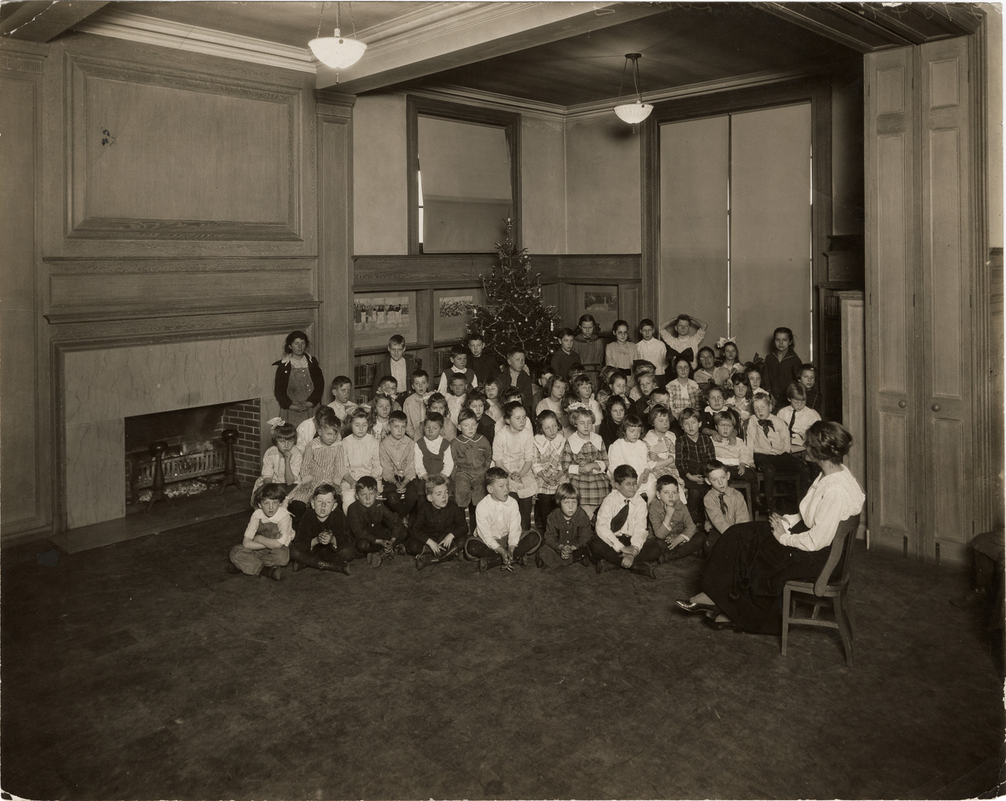 View of a librarian leading a Christmas story hour at the Duffield Branch Library, Detroit Public Library. Children pose in front of Christmas tree; fireplace on left. Handwritten on back: "Christmas story hour. Dec. 21, 1918. Duffield Branch Library, W. Grand Boulevard and Dunedin. This room connected by sliding doors with main room. Duffiled Branch interior view, photo taken in 1918."