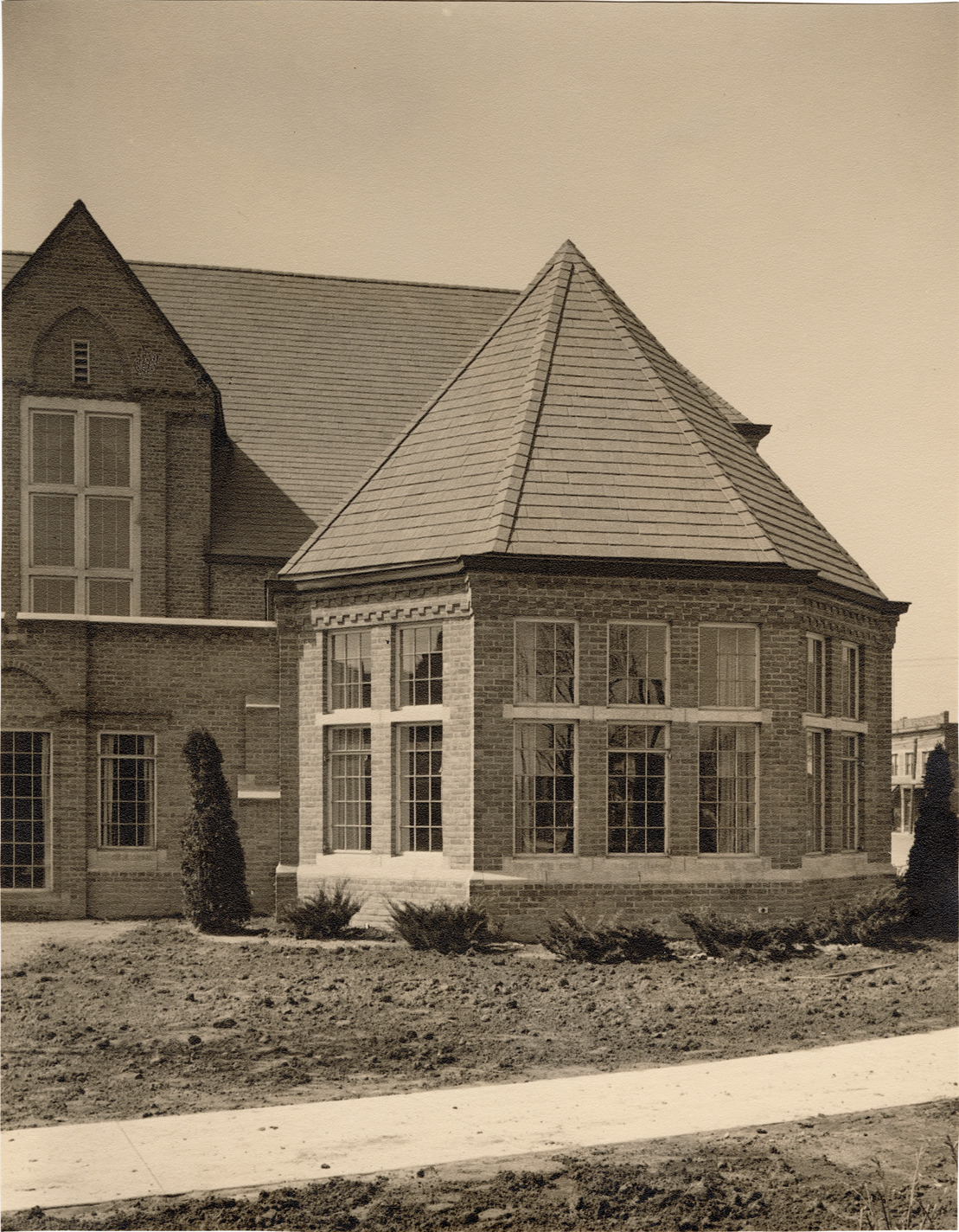 Exterior view of the Periodical Room at the Mark Twain Branch, Detroit Public Library. Typed on back: "Detroit Public Library, Mark Twain Branch. Exterior, Periodical Room." Handwritten on back: "Mark Twain Branch, building, exterior, periodical alcove, 1940."