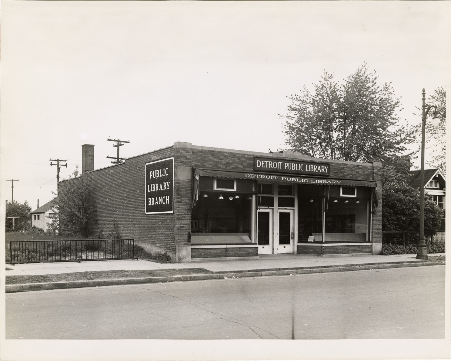 View of the North Woodward Branch Library, Detroit Public Library. Sign over entrance reads: "Detroit Public Library." Brick wall sign reads: "Public Library Branch." Stamped on back: "Detroit City Plan Commission. Photograph by Harold Raymond. No. CB5." Handwritten on back: "North Woodward Library, Seven Mile & John R. North Woodward rented quarters. Opened 1929. 40' x 60'."