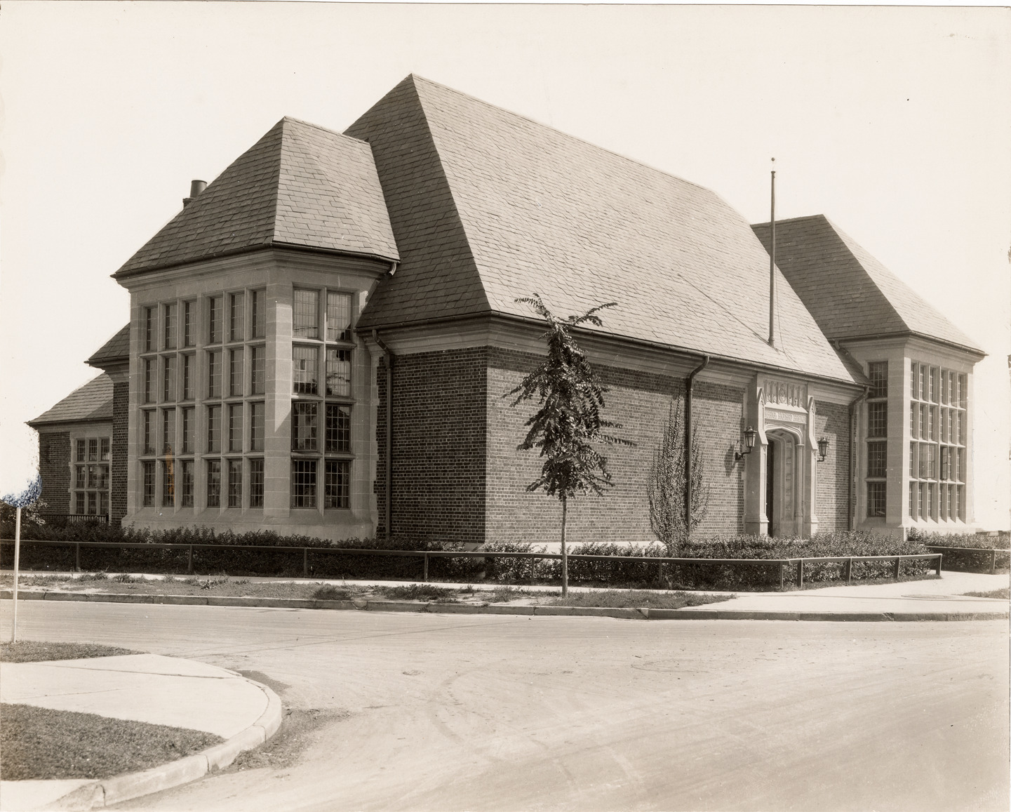 View of the Richard Branch Library, Detroit Public Library. Stamped on back: "Thomas Ellison, photographer of architecture. 2744 W. Grand Boulevard, Detroit." Typed on back: "Detroit Public Library. Richard Branch, exterior." Handwritten on back: "Richard Branch, building, exterior view."